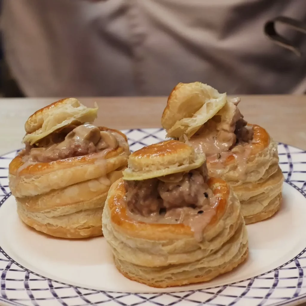 - Vol-au-vent pur beurre, dorure maîtrisée (jamais sur les chants) pour un feuilletage haut et feuilleté.